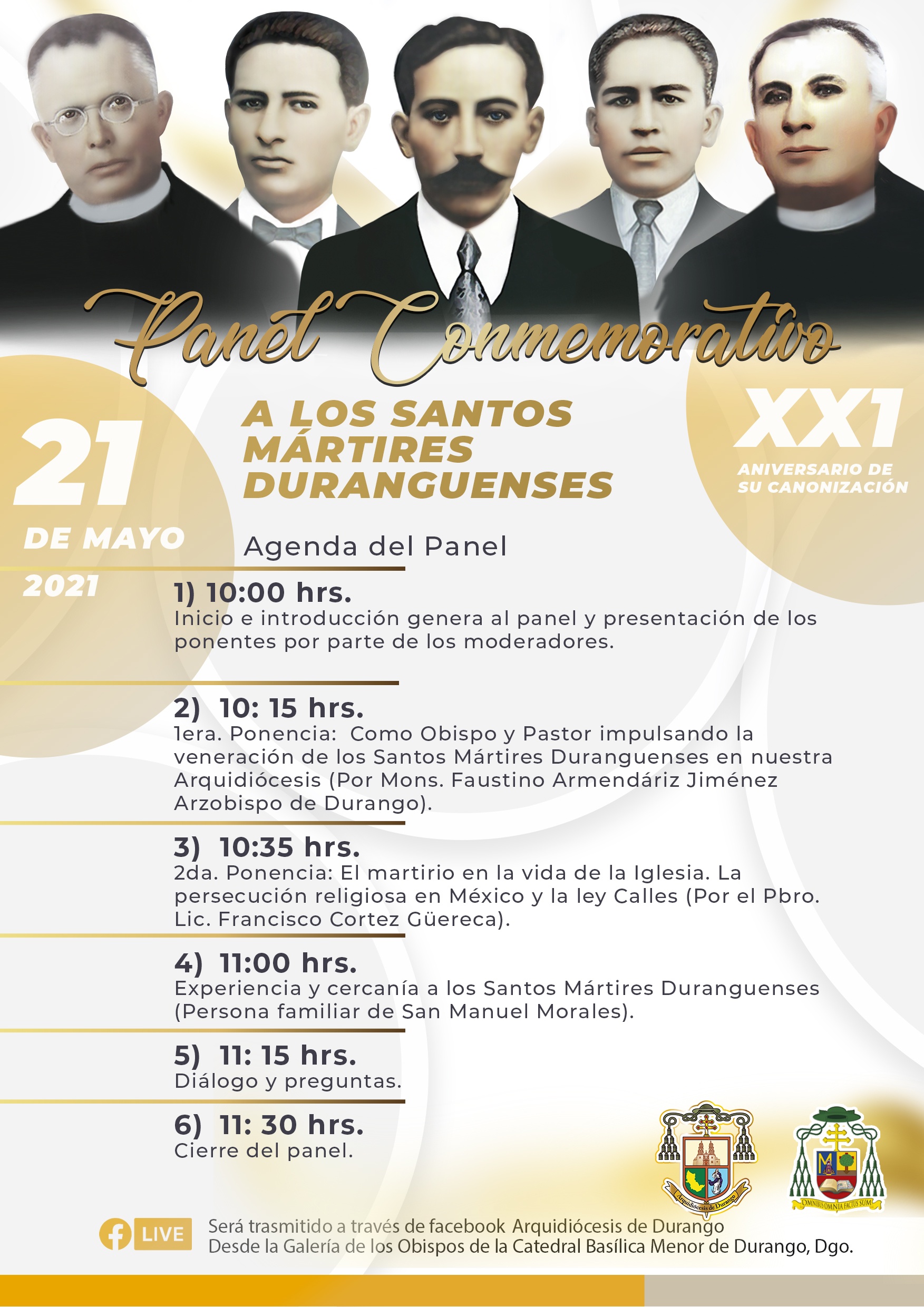 La Arquidiócesis de Durango, invita a los fieles católicos y público en general, a que sean partícipe del Panel Conmemorativo a los Santos Mártires Duranguenses, que se llevará a cabo el próximo 21 de mayo, a partir de las 10 de la mañana, transmitido a través de la página oficial de Facebook de la Arquidiócesis. El Panel se realiza para celebrar el XXI Aniversario de la Canonización de estos mártires que se conmemora ese 21 de mayo, quienes en defensa de la fe entregaron su vida, durante la persecución religiosa entre los años 1926 y 1929, en la llamada Guerra Cristera. Los cinco mártires que dieron testimonio de la fe hasta la muerte y que son reconocidos por nuestra Iglesia como Santos son: el padre San Luis Bátiz y los laicos San José Salvador Lara Puente, San Manuel Morales y San David Roldán, quienes fueron asesinados el 15 de agosto de 1926 en Chalchihuites, Zacatecas; y el padre San Mateo Correa, que fue asesinado el 6 de febrero de 1927 en la ciudad de Durango.