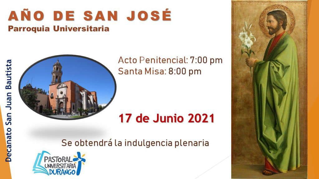 Durango, Dgo. 14 de Junio de 2021.- La Parroquia Universitaria de la Arquidiócesis de Durango, invita a todos los fieles a asistir al Acto Penitencial con motivo del Año de San José, el cual se llevará a cabo el próximo 17 de junio, en la Parroquia Universitaria, ubicada en Constitución esquina con 5 de febrero, en la zona centro de la ciudad local, a las 7 de la tarde y a las 8 se continúa con la Celebración Eucarística. Con este acto, se podrá obtener la Indulgencia Plenaria, la cual suprime plenamente la pena que se debe pagar por los pecados cometidos y confesados hasta ese momento. Además, se contará con la presencia de varios sacerdotes para confesar.