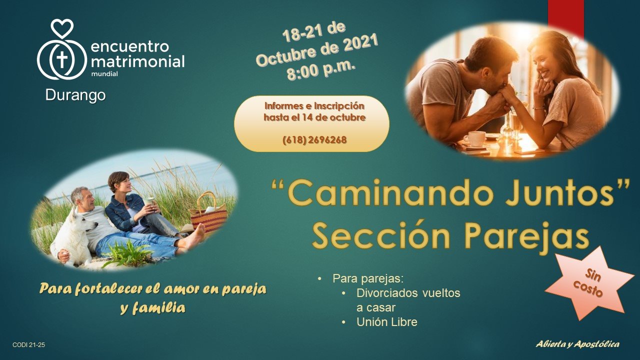 Durango, Dgo. 13 de Octubre de 2021.- El Movimiento de Encuentro Matrimonial de la Arquidiócesis de Durango, invita a parejas que vivan en unión libre, a que sean partícipe de la Experiencia “Caminado Juntos”, que se llevará a cabo del 18 al 21 de octubre, a las 8:00 p.m., la cual se desarrollará de manera virtual mediante la plataforma de Zoom. Tiene el objetivo de fortalecer el amor de la pareja y la familia, mediante temas y dinámicas que ayudan a reforzar el lazo de la unión en vida matrimonial. La experiencia es totalmente gratuita. Para mayores informes sobre el ID y la contraseña para ingresar, comunicarse directo al número 618 269 62 68.