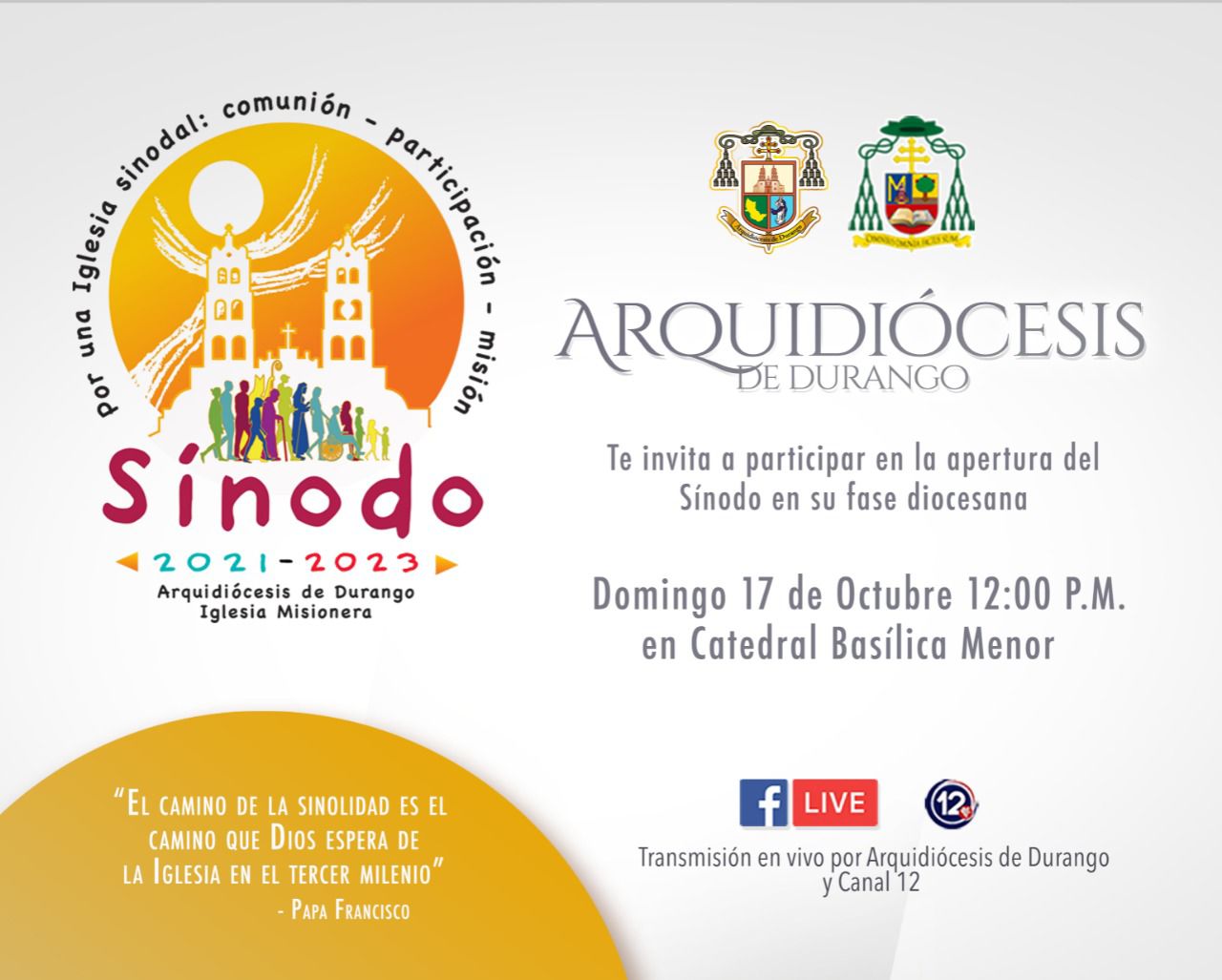 Durango, Dgo. 14 de Octubre de 2021.- El próximo Domingo 17 de Octubre se llevará a cabo la Misa de apertura de la Fase Diocesana del Sínodo sobre la sinodalidad en nuestra Arquidiócesis de Durango. Recordamos que los pasados 9 y 10 de octubre, con la Misa de Apertura y el Momento de Reflexión, el Papa Francisco dio inicio al Sínodo de los Obispos sobre la Sinodalidad que tiene como tema: “Por una Iglesia sinodal: comunión participación y misión”. Un itinerario que durará tres años y que esta articulado en tres fases (diocesana, continental y universal). El Sínodo es una gran oportunidad para una conversión pastoral en clave misionera, en comunión y misión, que designan el misterio y la naturaleza misma de la Iglesia. Nuestro Arzobispo, Mons. Faustino presidirá la celebración Eucarística de apertura desde la Catedral de Durango a las 12:00 del mediodía. Confiamos que será un tiempo de gracia para nuestra Arquidiócesis, pues como ya se ha dicho, Mons Faustino fue elegido para ser parte de la Comisión Teológica para el Sínodo, por tanto, es de gran importancia su participación para la Iglesia Católica no únicamente en Durango si no en todo el mundo. Los Delegados de las Conferencias Episcopales mantendrán diferentes encuentros con los miembros de la Secretaría del Sínodo y de las diferentes Comisiones para implementar los procedimientos a seguir en las Iglesias locales. Elevemos nuestra oración para que el Espíritu Santo nos asista y nos conceda participar y alcanzar muchos frutos espirituales de este Sínodo.