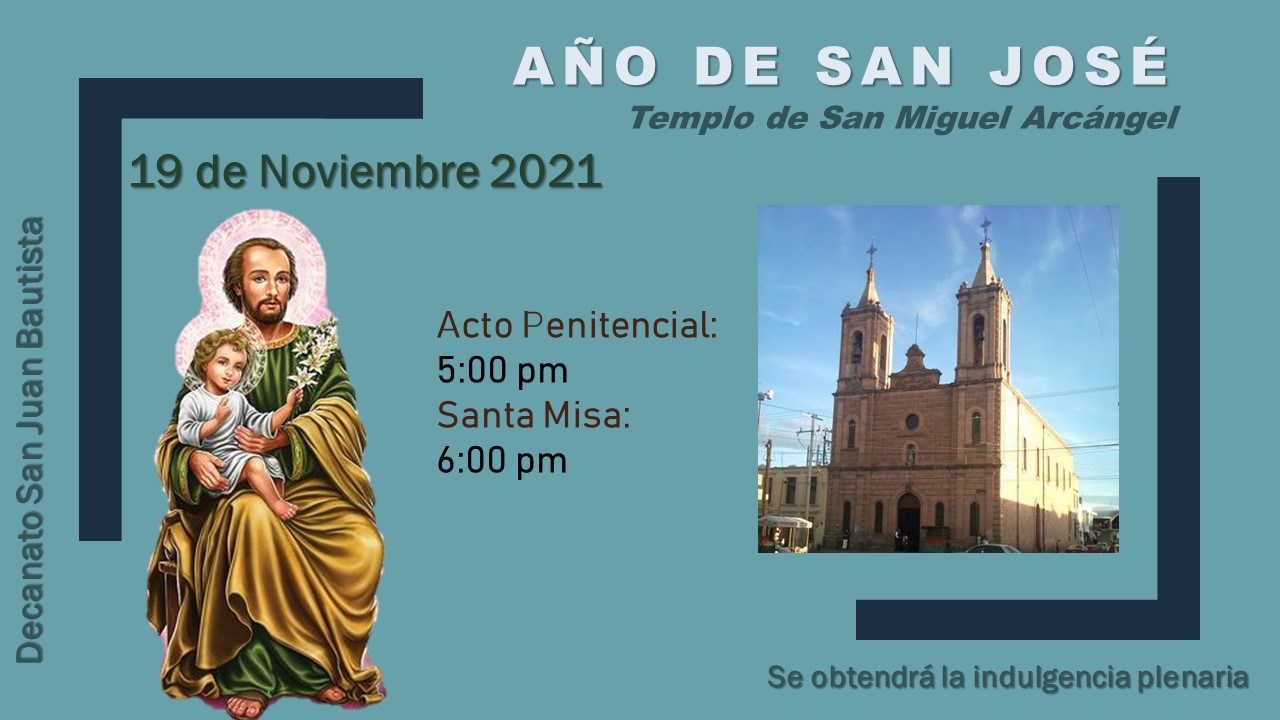 Durango, Dgo. 17 de Noviembre de 2021.- El Decanato San Juan Bautista, de la Iglesia local, llevará a cabo el Acto Penitencial del mes de noviembre, el próximo viernes 19, en el Templo de San Miguel Arcángel, ubicado en calle Pino Suárez esquina con Pasteur, en la zona centro de la ciudad local, a las 5 de la tarde. Este acto se realiza dentro del marco del Año de San José, en el cual se pueden obtener indulgencias plenarias. Además, se tendrán confesiones y a las 6 de la tarde, la Santa Misa.