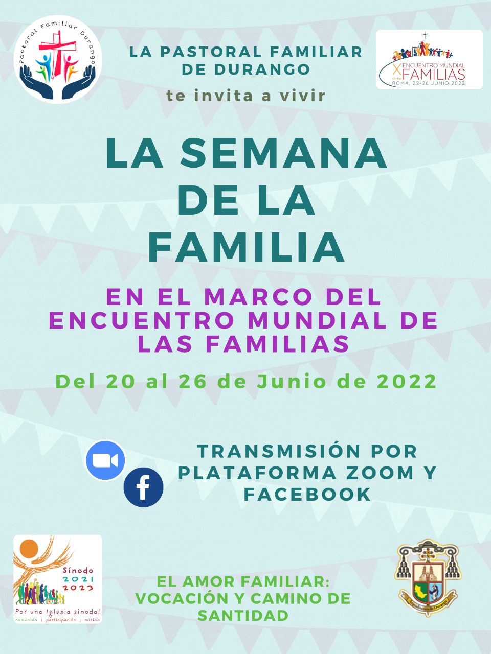 Durango, Dgo. 16 de Junio de 2022.- La Pastoral Familiar de la Arquidiócesis de Durango, invita a participar en la Semana de la Familia, que desarrollarán con motivo del X Encuentro Mundial de las Familias, del 20 al 26 de junio, mediante las siguientes actividades: del20 al 24, se llevarán a cabo diferentes conferencias todos los días a las 12 del día y 8:30 de la noche; del lunes al sábado se realizará a las 8 de la mañana el Rezo de Laudes y a las 6 de la tarde el rezo del Santo Rosario. Y el día domingo 26, la Santa Misa de Clausura a las 12 del día, en la Catedral Basílica Menor, presidida por Mons. Faustino Armendáriz Jiménez. Todas las conferencias serán transmitidas a través de la página de Facebook: Pastoral Familiar Durango.